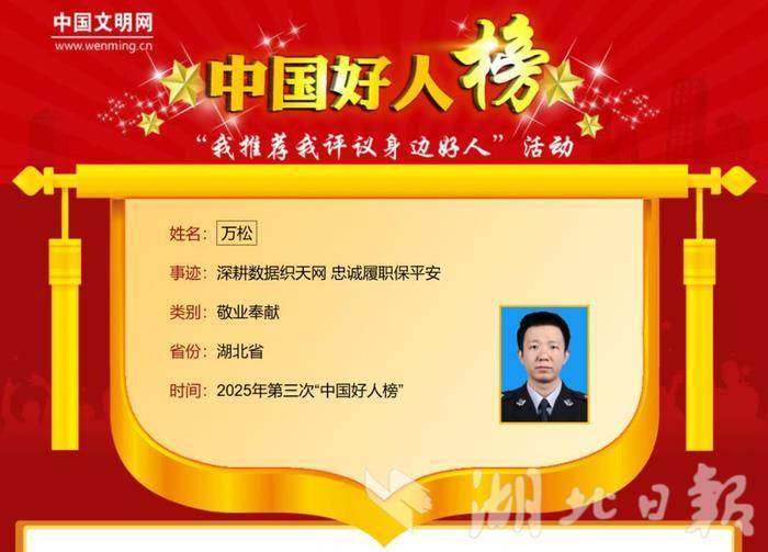 湖北日报讯(记者 杨然 通讯员 吴功轩)10月15日,我们从武汉市公安局获悉,该局因公殉职的民警万松入选“2025年第三批中华好人榜”。围绕此,将在新疆维吾尔自治区阿克苏地区举行。经过各地推荐,评论 经过网友和专家评审,共有138位有用、勇敢、诚实守信、尽职尽责、孝敬长辈、热爱亲人的好人上榜。其中,万松因其爱岗敬业的优秀品质而荣幸入选。万松,男,1975年2月出生,中共党员。生前,他是公安部四级警技主任 湖北省武汉市公安局信息科技支队三大队省。万松毕业于华中科技大学。他放弃了IT公司的高薪,毅然选择了自己热爱的公安职业。深耕安全科技领域28年,帮助破获重大案件160余起,带领团队开展打击电信网络诈骗、打黑除恶等专项研判任务110余项。主导开发了26个实用数据平台,为武汉公安智能警务系统建设做出了突出贡献。曾获个人一等功2025年5月26日,万松突然病倒,下岗。送往医院后,紧急救治无效。 5月27日因公牺牲,享年50岁。7月16日,万松被追授“省优秀共产党员”称号。